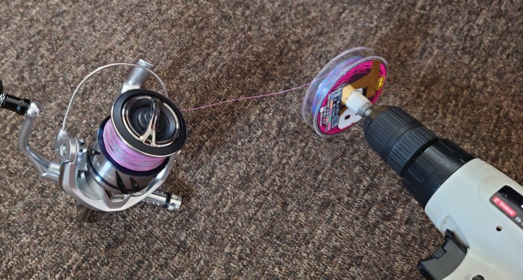 電動ドライバーに空スプールを固定して巻き取ります。電動ドライバー又はDAIWA PEラインチェンジャーのようなものがないと手作業では心が折れると思います。